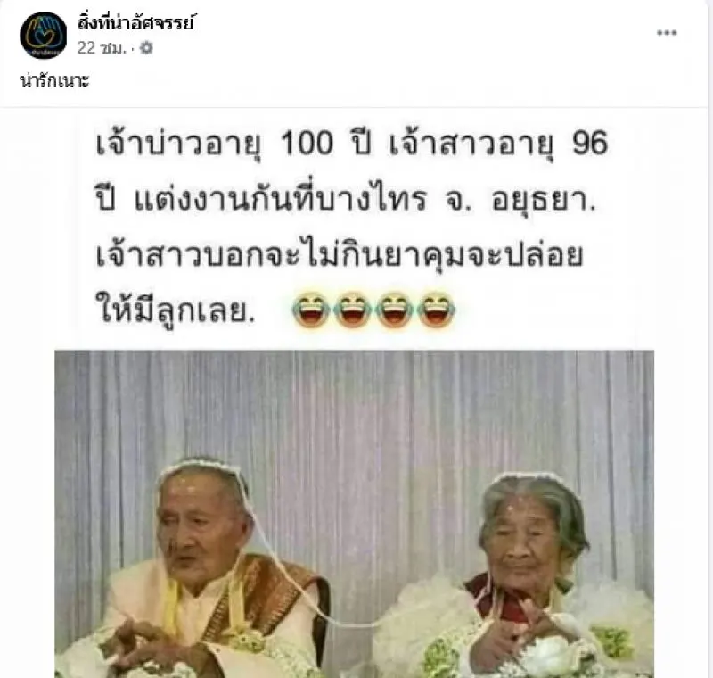 เรียกได้ว่าเป็นเรื่องราวที่มีคนต่างเข้ามาแสดงความคิดเห็นกันเป็นจำนวนมาก สำหรับเพจเฟซบุ๊กรายหนึ่งได้ออกมาโพสต์เรื่องราวของคุณตาคุณยายคู่หนึ่งโดยได้โพสต์ระบุว่า เจ้าบ่าวอายุ 100 ปี เจ้าสาวอายุ 96 ปี แต่งงานกัันที่บางไทร จังหวีดอยุธยา
