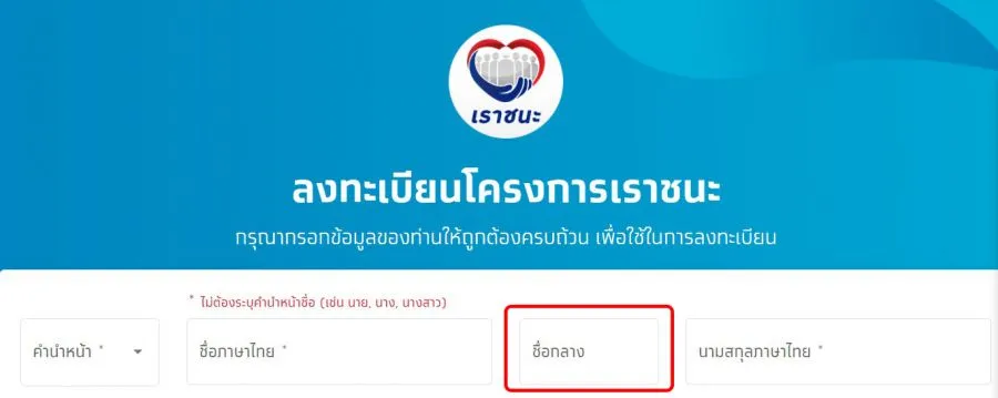 ลงทะเบียน #เราชนะ ช่องชื่อกลางห้ามใส่ชื่อเล่น หากไม่มีไม่ต้องใส่ ให้ใส่แค่ชื่อและนามสกุล ให้ตรงช่องเท่านั้น