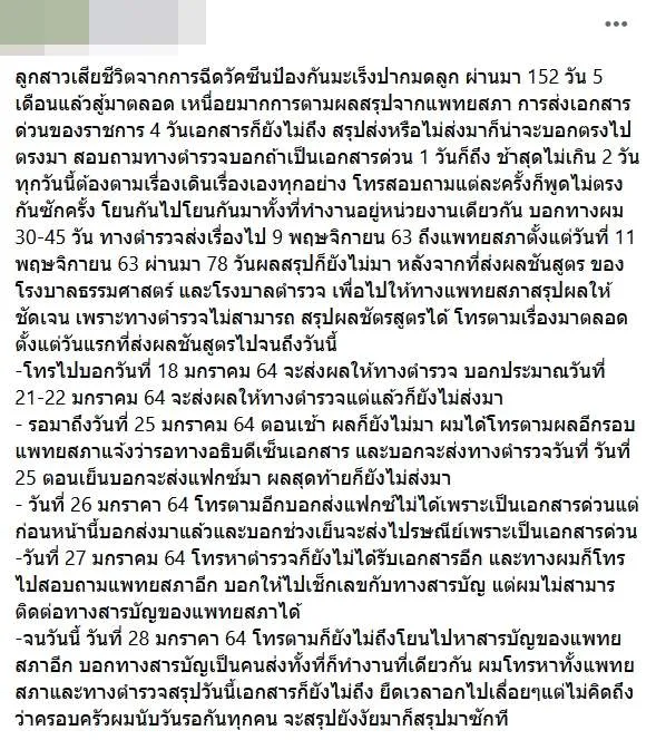 ลูกสาวเสียชีวิตจากการฉีดวัคซีนป้องกันมะเร็งปากมดลูก ผ่านมา 152 วัน 5 เดือนแล้วสู้มาตลอด เหนื่อยมากการตามผลสรุปจากแพทยสภา การส่งเอกสารด่วนของราชการ 4 วันเอกสารก็ยังไม่ถึง สรุปส่งหรือไม่ส่งมาก็น่าจะบอกตรงไปตรงมา สอบถามทางตำรวจบอกถ้าเป็นเอกสารด่วน 1 วันก็ถึง ช้าสุดไม่เกิน 2 วัน ทุกวันนี้ต้องตามเรื่องเดินเรื่องเองทุกอย่าง โทรสอบถามแต่ละครั้งก็พูดไม่ตรงกันซักครั้ง โยนกันไปโยนกันมาทั้งที่ทำงานอยู่หน่วยงานเดียวกัน บอกทางผม 30-45 วัน ทางตำรวจส่งเรื่องไป 9 พฤษจิกายน 63 ถึงแพทยสภาตั้งแต่วันที่ 11 พฤษจิกายน 63 ผ่านมา 78 วันผลสรุปก็ยังไม่มา หลังจากที่ส่งผลชันสูตร ของโรงบาลธรรมศาสตร์ และโรงบาลตำรวจ เพื่อไปให้ทางแพทยสภาสรุปผลให้ชัดเจน เพราะทางตำรวจไม่สามารถ สรุปผลชัตรสูตรได้ โทรตามเรื่องมาตลอดตั้งแต่วันแรกที่ส่งผลชันสูตรไปจนถึงวันนี้