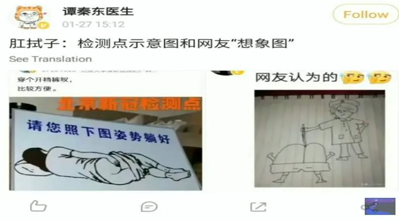 คุณหมอ Li Tongzeng กล่าวว่าการแหย่ก้นเก็บตัวอย่างเช่นนี้ จะช่วยเพิ่มอัตราการตรวจหาผู้ติดเชื้อให้มากขึ้น เนื่องจากร่องรอยของไวรัสอยู่ในทวารหนักนานกว่าทางเดินหายใจ