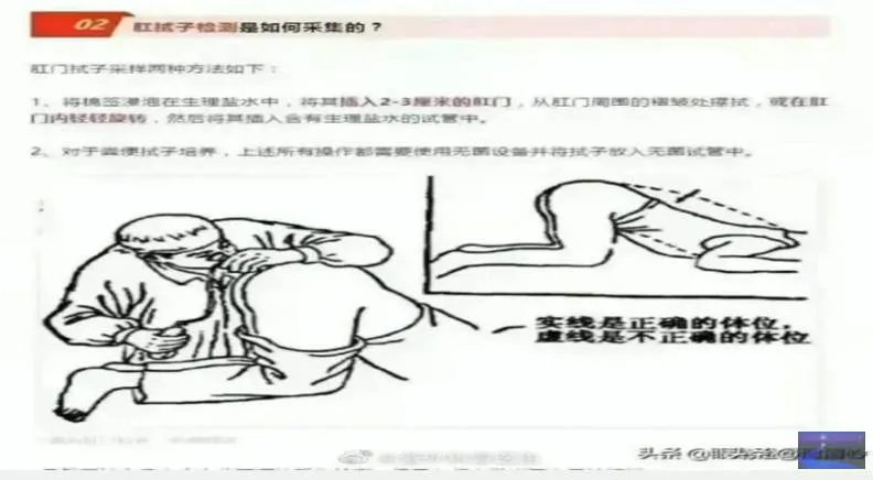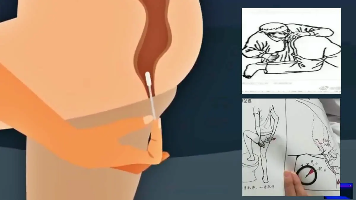 การแหย่ก้นเก็บตัวอย่างจะนำก้านสำลียาว 3-5 เซนติเมตรแหย่เข้าไปในก้น คว้านก้านในนั้นอยู่ประมาณ 4-5 ครั้งก่อนที่จะดึงออกมา รวมแล้วใช้เวลาไม่น่าเกิน 10 วินาที