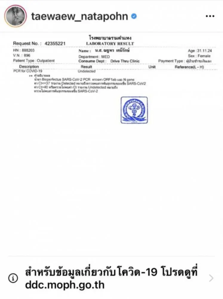 โดยนางเอกสาวได้โชว์ผลตรวจ พร้อมกับเขียนแคปชั่นว่า Quarantine Day11 (อีก3วันเท่านั้น) เป็นกำลังใจให้ด้วยนะคะ #แต้วต้องรอด