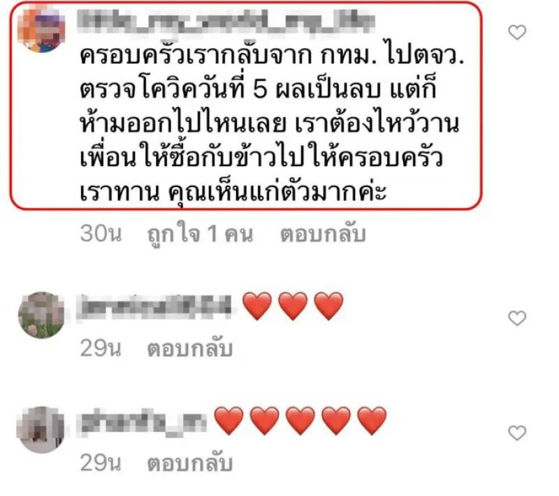 นอกจากมีคนเข้ามาให้กำลังใจแล้ว แต่ก็ยังมีคนเข้ามาคอมเมนต์ถามพร้อมตำนิเรื่องที่บอกว่า ครอบครัวเรากลับจาก กทม. ไปตจว. ตรวจโควิควันที่ 5 ผลเป็นลบ แต่ก็ห้ามออกไปไหนเลย เราต้องไหว้วานเพื่อนให้ซื้อกับข้าวไปให้ครอบครัวเราทาน คุณเห็นแก่ตัวมากค่ะ