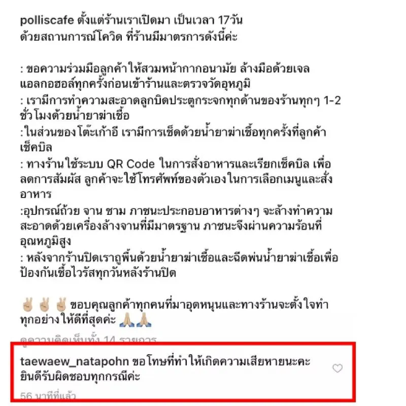 ซึ่งผลจากการกระทำดังกล่าวของสาวแต้ว ทำให้ร้านคาเฟ่ที่สาวแต้วไปถ่ายรูปนั้น ต้องมีการออกมาชี้แจงมาตรการความปลอดภัย พร้อมปิดตัวเองเพื่อทำบิ๊กคลีนนิ่ง และจะกลับมาเปิดอีกครั้งในวันที่ 3 ก.พ. 2564 โดยแต้วได้เข้าไปขอโทษที่ทำให้ทางร้านเดือดร้อน และยินดีที่จะชดใช้ในความเสี ยห ายนี้ แต่ก็ยังมีคำถามตามมา ใครเป็นถ่ายรูปให้แต้ว และทางร้านเมื่อทราบว่าแต้ว ซึ่งมีความเสี่ยงทำไมถึงยอมแต้วออกมาใช้บริการในที่สาธารณะที่ใช้ร่วมกับผู้อื่น
