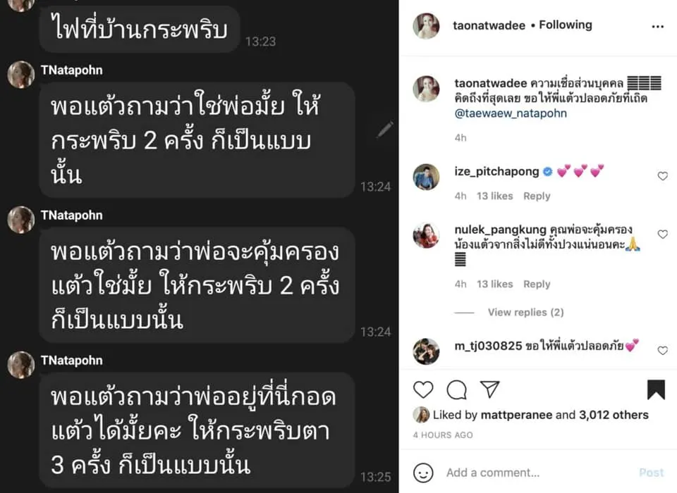 โดย “แต้ว ณฐพร” ได้เล่าว่า ไฟที่บ้านกระพริบ พอแต้วถามว่าใช่พ่อมั้ย ให้กระพริบ 2 ครั้ง ก็เป็นแบบนั้น พอแต้วถามว่าพ่อจะคุ้มครองแต้วใช่มั้ย ให้กระพริบ 2 ครั้ง ก็เป็นแบบนั้น พอแต้วถามว่าพ่ออยู่ที่กอดแต้วได้มั้ยคะ ให้กระพริบตา 3 ครั้ง ก็เป็นแบบนั้น