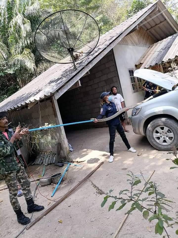 เจ้าหน้าที่กู้ภัยหญิงคนนี้เปิดเผยว่าวันนี้(2 ก.พ.) รับแจ้งจากชาวบ้านจึงไปตรวจสอบพบงูจงอางอยู่ในกระโปรงรถขดอยู่บนเครื่องยนต์ จึงใช้บ่วงจับแล้วใช้มือบีบที่คองูเพื่อจับลงถุงแต่งูตัวนี้แรงเยอะมากจึงใช้บ่วงรัดอีกทีก่อนจับงูใส่ถุงปุ๋ยเพื่อนำไปปล่อยคืนสู่ธรรมชาติ.