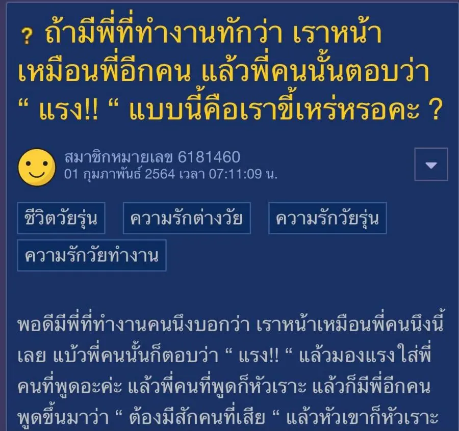 ถ้ามีพี่ที่ทำงานทักว่า เราหน้าเหมือนพี่อีกคน แล้วพี่คนนั้นตอบว่า "แรง!!" แบบนี้คือเราขี้เหร่เหรอคะ ?