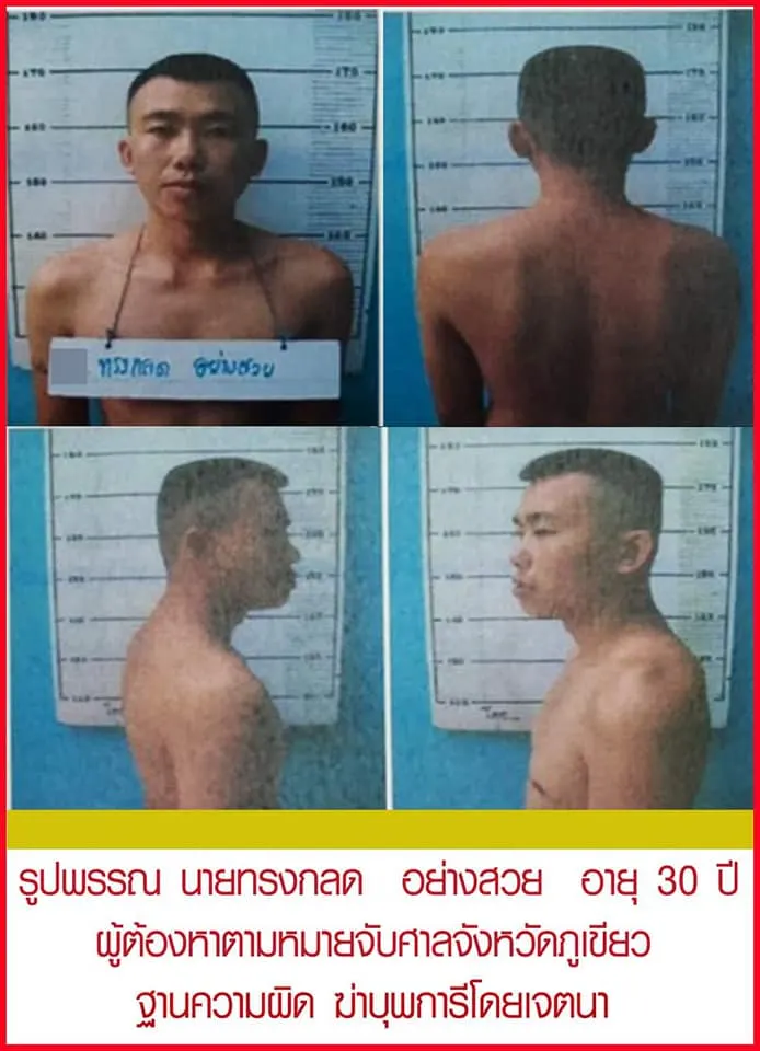 ชื่อ นายทรงกลด อย่างสวย อายุ 30 ปี ผู้ต้องหาตามหมายจับศาลจังหวัดภูเขียว ฐานความผิด ฆ่าบุพการีโดยเจตนา พื้นที่ สภ.บ้านแท่น จ.ชัยภูมิ