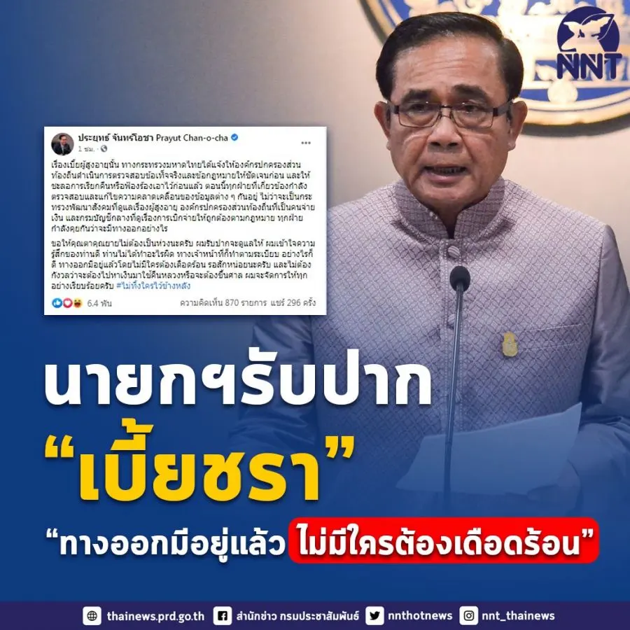 พล.อ.ประยุทธ์ จันทร์โอชา นายกรัฐมนตรีและรมว.กลาโหม โพสต์ข้อความผ่านเฟซบุ๊ก "ประยุทธ์ จันทร์โอชา Prayut Chan-o-cha" เกี่ยวกับกรณีเบี้ยยังชีพผู้สูงอายุว่า ทางกระทรวงมหาดไทยได้แจ้งให้องค์กรปกครองส่วนท้องถิ่นดำเนินการตรวจสอบข้อเท็จจริงและข้อกฎหมายให้ชัดเจนก่อน และให้ชะลอการเรียกคืนหรือฟ้องร้องเอาไว้ก่อนแล้ว ตอนนี้ทุกฝ่ายที่เกี่ยวข้องกำลังตรวจสอบและแก้ไขความคลาดเคลื่อนของข้อมูลต่างๆ กันอยู่ ไม่ว่าจะเป็นกระทรวงพัฒนาสังคมที่ดูแลเรื่องผู้สูงอายุ องค์กรปกครองส่วนท้องถิ่นที่เป็นคนจ่ายเงิน และกรมบัญชีกลางที่ดูเรื่องการเบิกจ่ายให้ถูกต้องตามกฎหมาย ทุกฝ่ายกำลังคุยกันว่าจะมีทางออกอย่างไร