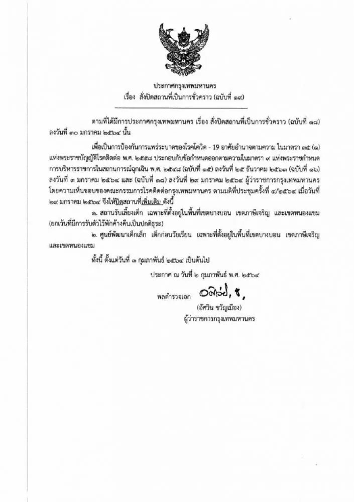 นอกจากนี้กรุงเทพมหานคร ได้มีคำสั่งปิดศูนย์พัฒนาเด็กก่อนวัยเรียนของกรุงเทพมหานครในพื้นที่เขตบางบอน เขตหนองแขม และเขตภาษีเจริญ ตั้งแต่บัดนี้จนกว่าจะมีการเปลี่ยนแปลง เพื่อเป็นการควบคุมการแพร่ cv-19