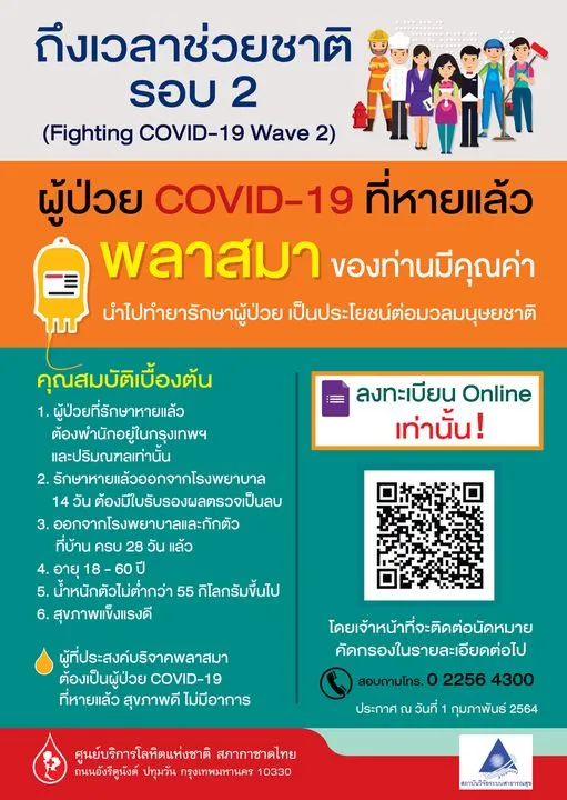 ถึงเวลาช่วยชาติ รอบ 2 ขอเชิญผู้ป่วยโรคโควิด-19 ที่หายแล้ว สุขภาพแข็งแรงดี มาบริจาคพลาสมา สามารถลงทะเบียนออนไลน์ ได้ที่ Facebook fan page ศูนย์บริการโลหิตแห่งชาติ สภากาชาดไทย