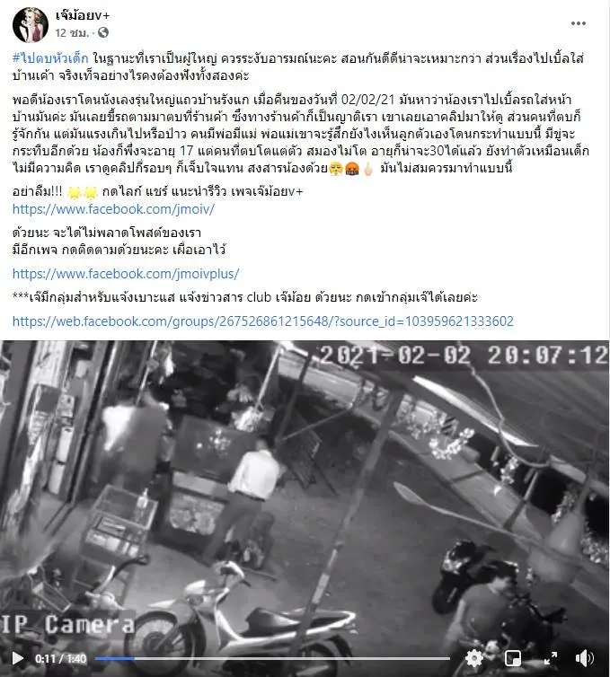 เพจเจ๊ม้อยv+ ได้แชร์คลิปวีดิโอ ใจความว่า "#ไปตบหัวเด็ก ในฐานะที่เราเป็นผู้ใหญ่ ควรระงับอารมณ์นะคะ สอนกันดีดีน่าจะเหมาะกว่า ส่วนเรื่องไปเบิ้ลใส่บ้านเค้า จริงเท็จอย่างไรคงต้องฟังทั้งสองค่ะ