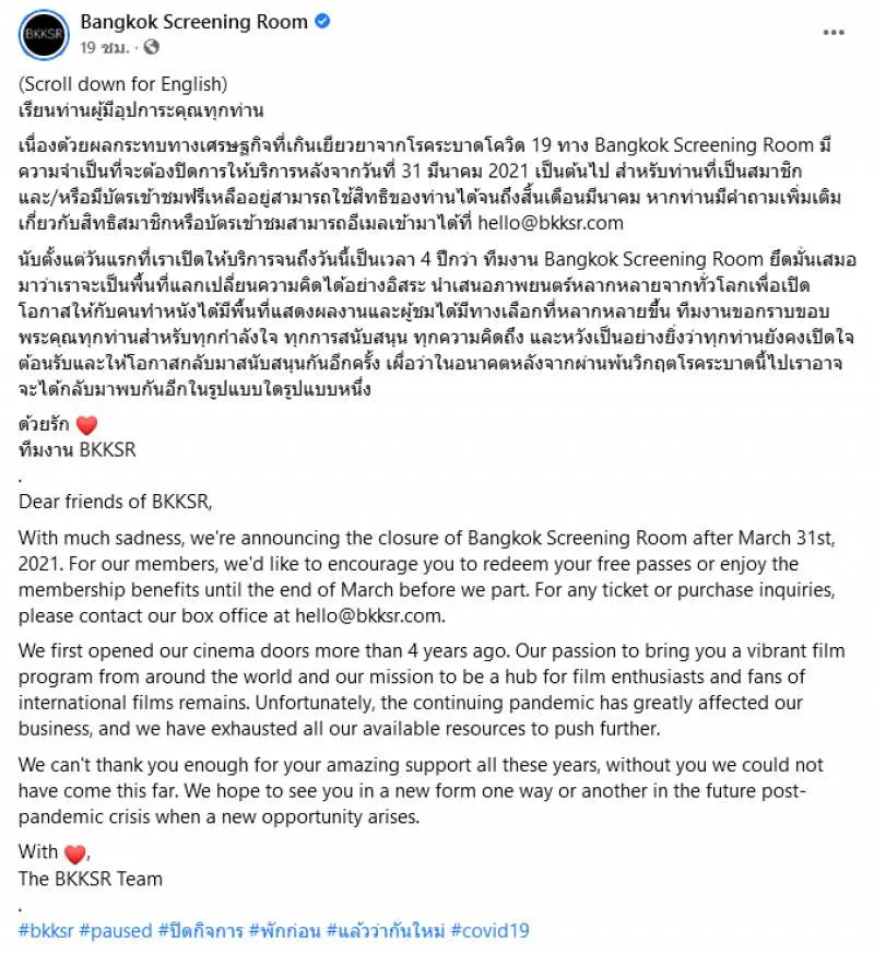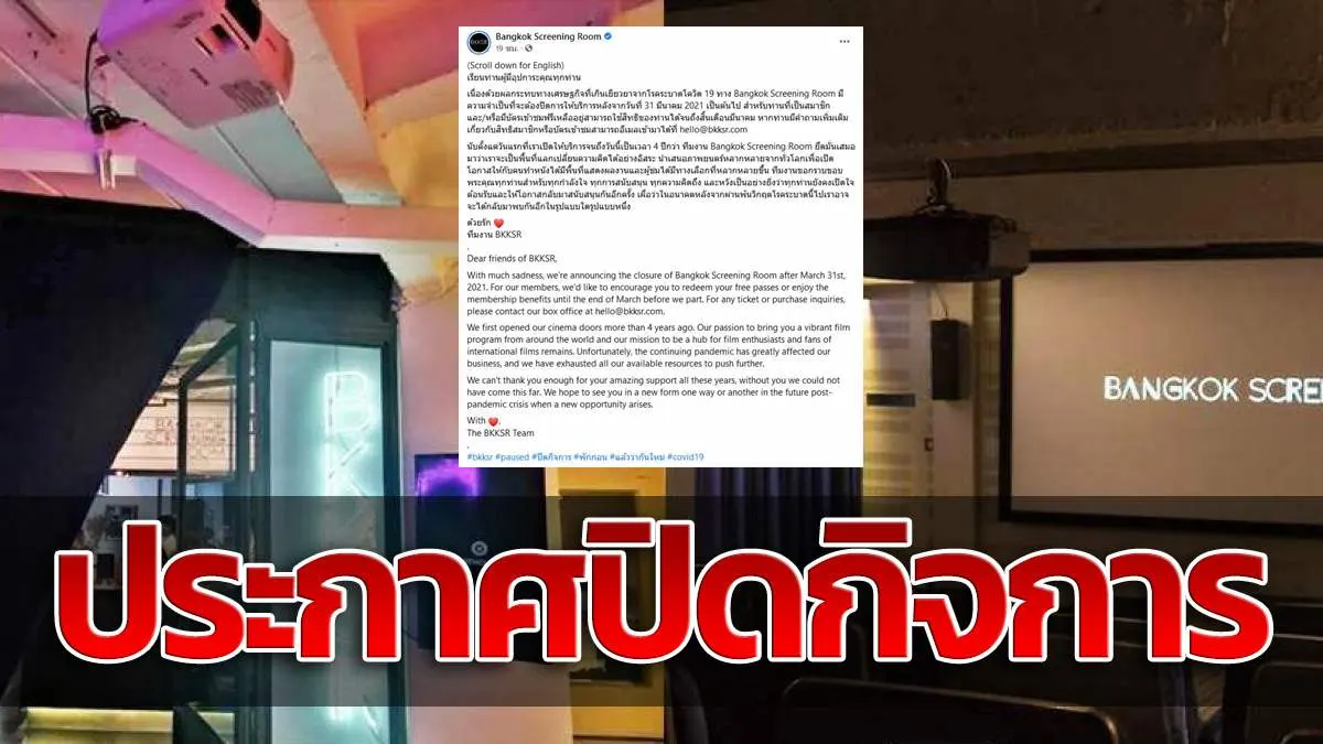 เมื่อวันที่ 4 ก.พ. เฟซบุ๊กของ Bangkok Screening Room โรงหนังอิสระชื่อดังย่านศาลาแดง ออกมาโพสต์ ประกาศปิดโรงหนั ง หลังเปิดให้บริการมากว่า 4 ปี โดยระบุว่า เรียนท่านผู้มีอุปการะคุณทุกท่าน เนื่องด้วยผลกระทบทางเศรษฐกิจที่เกินเยียวย าจากแพร่กระจายของ CV-19 ทาง Bangkok Screening Room มีความจำเป็นที่จะต้องปิดการให้บริการหลังจากวันที่ 31 มีนาคม 2021 เป็นต้นไป