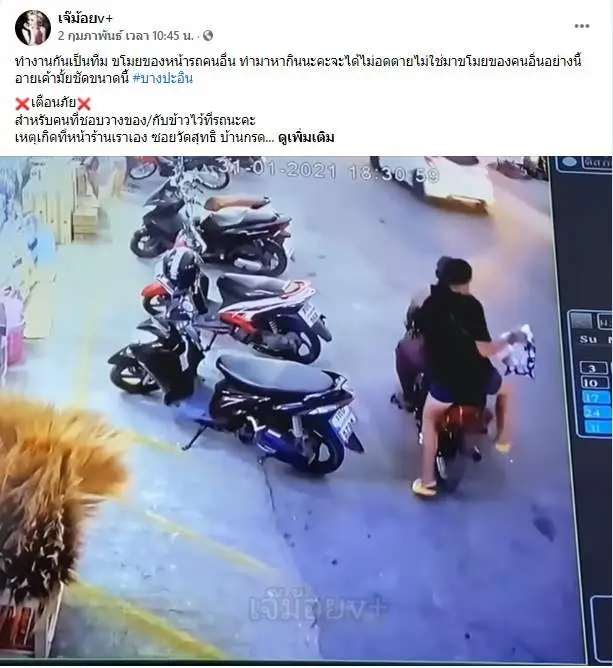 มีการเพยแพร่วีดีโอคลิปเกี่ยวกับมิจฉาชีพตะเวนหาลักของคนอื่นตามรถจักรยานยนต์ ในคลิปสังเกตุว่า มีหญิงสวมกางเกงขาสั่น เสื้อสีดำ ทำทีเดินดูสถานการณ์ก่อน แล้ว มีผู้ชายขับรถมอตอร์ไซค์มารอจังหวะ แล้วก็รีบยิบเอาของที่แขวนอยู่รถมอเตอร์ไซค์ ก่อนจะรีบหลบหนี้ไป