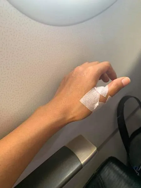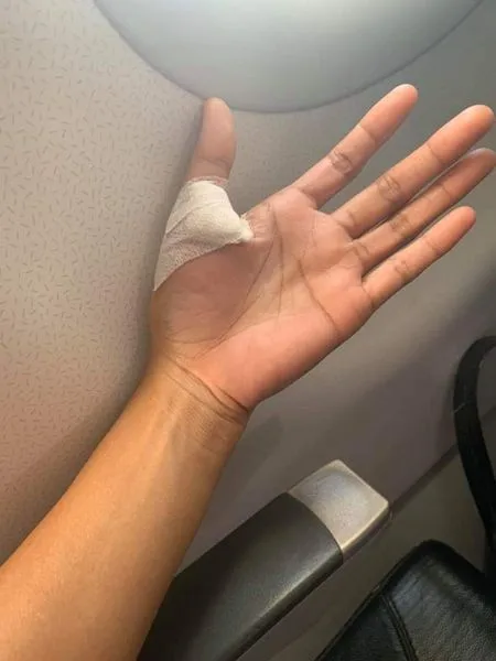 วันที่ 1 มกราคม 256 เวลา 16:30 ฉันมีเที่ยวบินอุบลราชธานี-กรุงเทพโดยสายการบินไทยเวียตเจ็ทและมือมีอาการบาดเจ็บจาก นิ้วล๊อคพึ่งออจาก ร.พ. มือยังบวมและปวดอยู่และตรงมาสนามบินเลย ขณะที่ขึ้นเครื่องเพื่อที่จะเดินมาที่นั่งตัวเองมือหนึ่งยังคุยโทรศัพท์กับทางบ้านอยู่เหลือข้างที่มีปัญหาพอดีมีกระเป๋าเป้มาหนึ่งเลยพูดกับแอร์ฯ ไปว่า