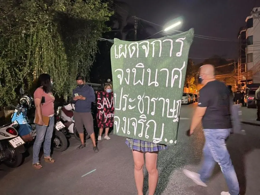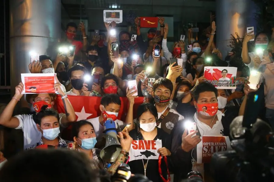 4 กุมภาพันธ์ 2564 ความเคลื่อนไหวของคนเมียนมา ในไทย มีการชุมนุมหน้าสถานทุตเมียนมา ในไทย ถ.สาทรเหนือ จัดกิจกรรมส่องไฟต้านรัฐประหาร แสดงออกทางสัญลักษณ์ เวลา 20.00 น. แต่ก่อนหน้านั้น ผู้ชุมนุม เรียกตน #ม็อบ4กุมภา #LightUpMyanmar จุดไฟเผารูป พล.อ. มิน อ่อง ลาย ถูกตัดต่อคู่ไดโนเสาร์