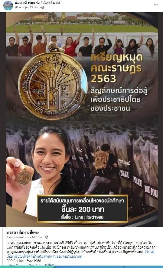 "การต่อสู้ของนักศึกษาและประชาชนในปี 2563 เป็นการต่อสู้เพื่อประชาธิปไตยที่ยิ่งใหญ่ของคนไทยไม่แพ้การต่อสู้ของคนเสื้อแดงเมื่อ 10 ปีก่อน เหรียญหมุดคณะราษฏรนี้จะเป็นเครื่องหมายระลึกถึงความกล้าหาญของคนหนุ่มสาวที่ลุกขึ้นมาเรียกร้องให้ปฏิรูปสถาบันกษัตริย์ซึ่งเป็นหัวใจของปัญหาทั้งหมด #โปรดเก็บเหรียญที่ระลึกนี้ให้กับลูกหลานของคุณในอนาคต