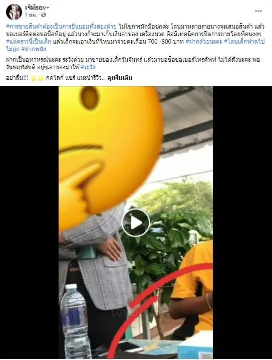 เพจเจ๊ม้อยv+ ได้แชร์คลิปวีดีโอกรณีหญิงสาวรายนึงเข้ามาขายสินค้าในบริเวณร้านขายของ ซึ่งเป็นการมัดมือชกยัดเยียดขายและที่สำคัญจะขายให้เด็ก แล้วเด็กจะเอาเงินจากไหนมาจ่ายให้ จนมีพลเมืองดีเข้ามาช่วยเหลือซึ่งได้อัดคลิปไว้ ใจความว่า "คุณมาขายของให้เด็กนี่เหรอ น้องเขาจะเอาจากไหนมาให้คุณ"