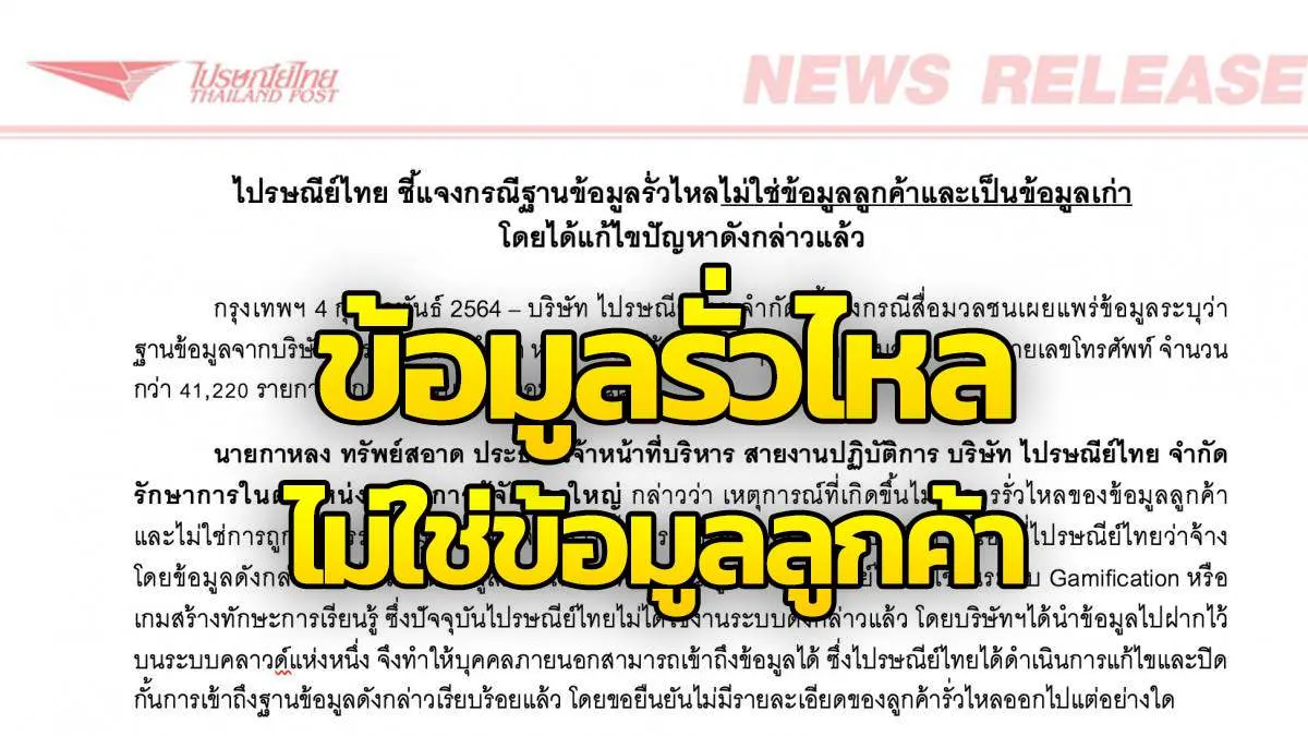 "เหตุการณ์ที่เกิดขึ้นไม่ใช่การรั่วไหลของข้อมูลลูกค้า และไม่ใช่การถูกโจรกรรมข้อมูล แต่เกิดจากการตั้งค่าระบบที่ผิดพลาดของบริษัทภายนอกที่ไปรษณีย์ไทยว่าจ้าง โดยข้อมูลดังกล่าวที่รั่วไหลเป็นข้อมูลภายในของพนักงาน/ลูกจ้างไปรษณีย์ไทยที่ใช้ในระบบ Gamification หรือ เกมสร้างทักษะการเรียนรู้ ซึ่งปัจจุบันไปรษณีย์ไทยไม่ได้ใช้งานระบบดังกล่าวแล้ว