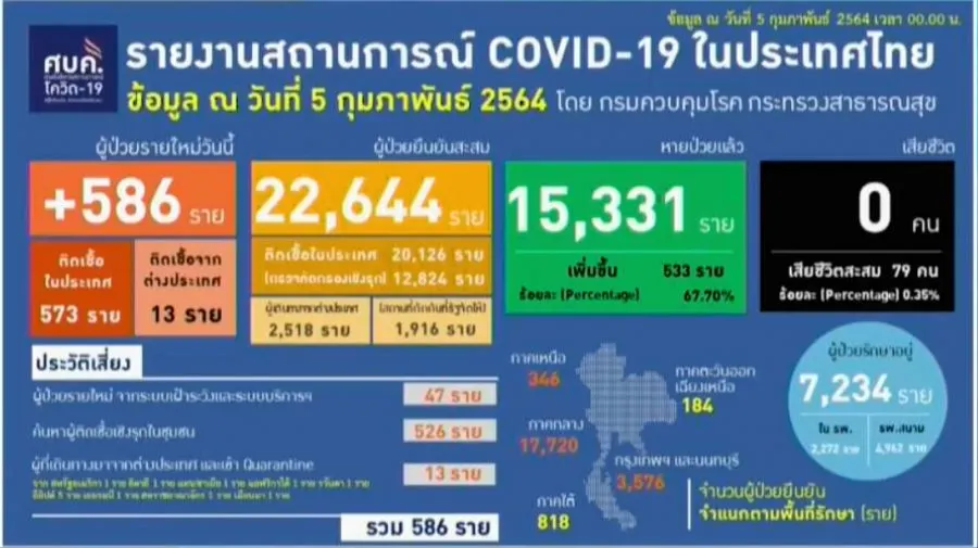 - มีผู้ป่วยรายใหม่เพิ่ม 586 ราย (สะสม 22,644 ราย)