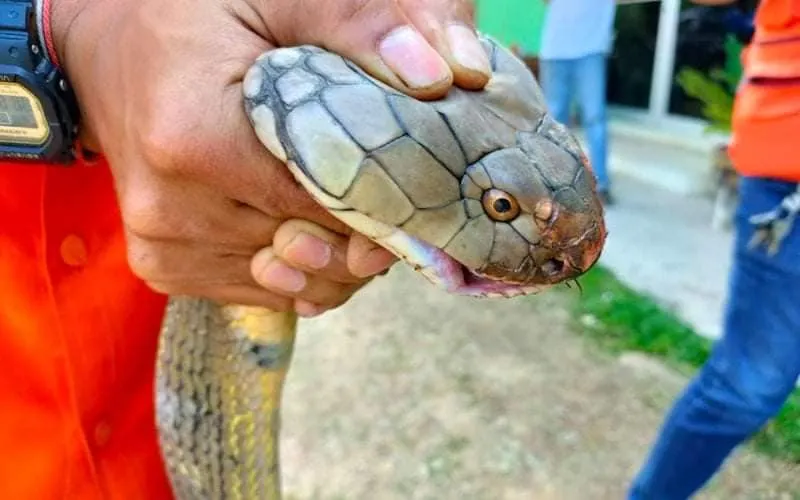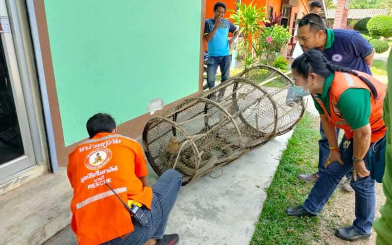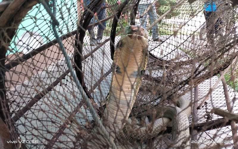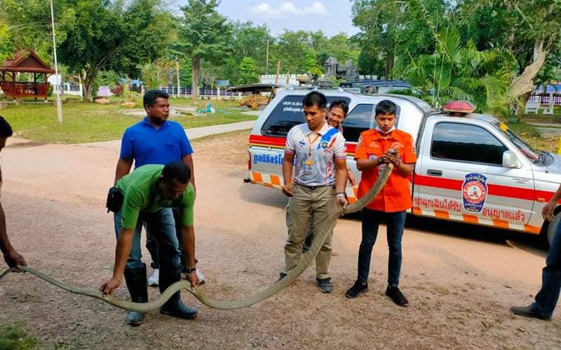 วันที่ 4 ก.พ.64 หน่วยกู้ภัยอริโยสามัคคีนาทวี อ.นาทวี จ.สงขลา ได้รับแจ้งจากกู้ชีพองค์การบริหารส่วนตำบล (อบต.) ทับช้าง ว่าได้มีนายทวีศักดิ์ เพ็ชรจง อายุ 40 ปี อยู่บ้านเลขที่ 66 ม.3 ต.ทับช้าง อ.นาทวี จ.สงขลา ได้นำไซดักปลาขึ้นจากคลองที่ตนเองนำไซไปดักปลาในคลองใกล้ๆบ้าน หลังจากนั้นก็ได้เดินไปดูไซดักปลาว่ามีปลามาติดไซบ้างหรือเปล่า แต่พอไปถึงเห็นงูจงอางตัวใหญ่ติดอยู่ในไซดักปลา จึงได้นำขึ้นมาจากคลอง และนำไซดักปลามาไว้ที่หน้าศูนย์สารสนเทศตำบลทับช้าง อ.นาทวี แล้วจึงแจ้งกู้ภัยให้มาช่วยจับงูจงอาง เนื่องจากงูจงอางตัวใหญ่มากและที่สำคัญชูคอสู้อยู่ตลอดเวลาจึงไม่กล้าจับงูจงอาง แต่ขอให้กู้ภัยมาช่วยจับงูจงอาง