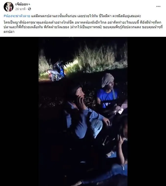 เพจเจ๊ม้อยได้โพจว่า #น้องจะฆ่าตัวตาย แต่มีคนตกปลาแถวนั้นเห็นก่อน เลยช่วยไว้ทัน ชีวิตมีค่า ควรมีสติอยู่เสมอค่ะ