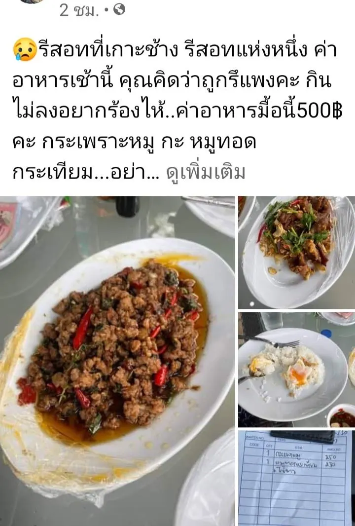 รีสอทที่เกาะช้าง รีสอทแห่งหนึ่ง ค่าอาหารเช้านี้ คุณคิดว่าถูกรึแพงคะ กินไม่ลงอยากร้องไห้..ค่าอาหารมื้อนี้500฿ คะ กระเพราะหมู กะ หมูทอดกระเทียม...อย่างละ 250฿ ได้ถามพนักงานว่าคิดผิดรึป่าว เค้าบอกว่าสั่งราดข้าว กับ สั่งเปนกับข้าวราคาเท่ากัน เราเลยยิ้มๆๆแร้วให้ตังไป...ขอโทดนะคะแค่อยากถามเฉยๆคะมีใคเคยเจอแบบนี้บ้างงง