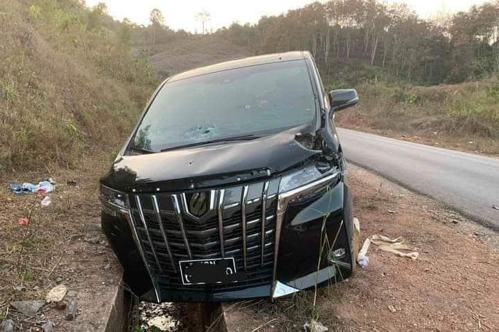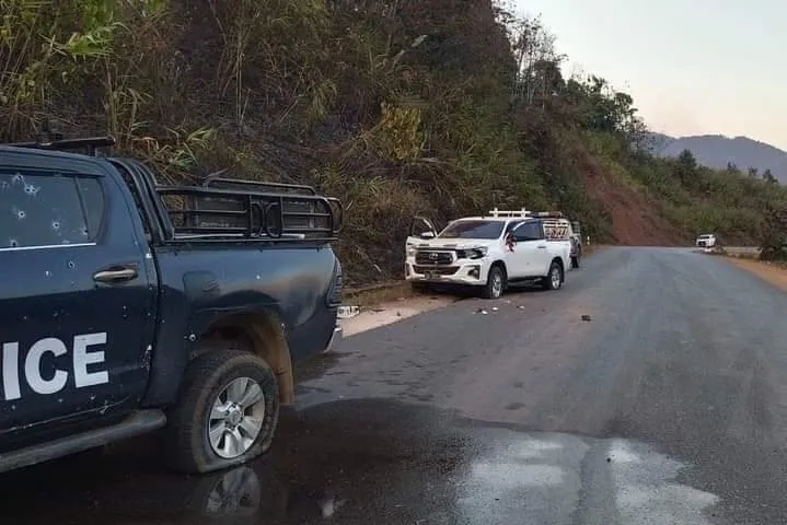 รถตำรวจในเมียนมา ในเมืองเล่าไก่ รัฐฉานเหนือ ถูกกองกำลังไม่ทราบฝ่ายดักยิงถล่มทำให้ตำรวจที่นั่งมาเสียชีวิตไป 12 นาย .