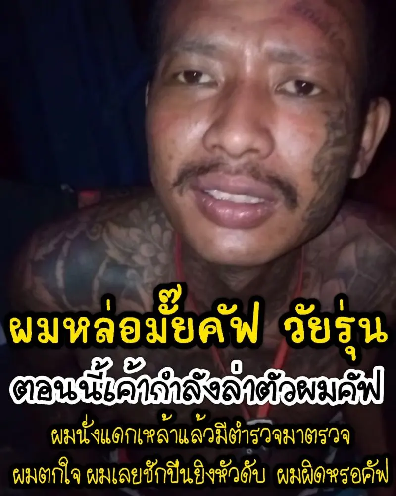 ผมนั่งกินเหล้าที่ปั้มแถวสุพรรณ มีรอง สว. มาขอตรวจ ผมเลยเอาปืนยิงหัวท่านแล้วหนี ตอนนี้มีแต่คนตามล่าตัวผมอยู่คัฟ อยู่ที่ว่าจะเจอผมแบบเป็นหรือตาย แต่..ตายดีกว่าคัฟ อยู่ไปก็รกโลกคัฟ