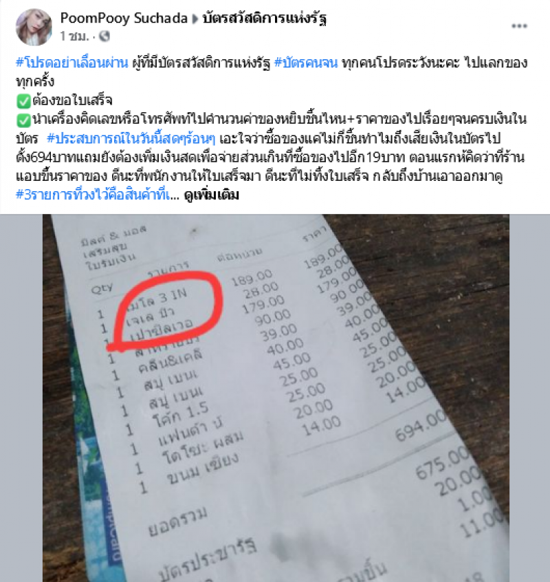 โปรดอย่าเลื่อนผ่าน ผู้ที่มีบัตรสวัสดิการแห่งรัฐ #บัตรคนจน ทุกคนโปรดระวังนะคะ ไปแลกของทุกครั้ง ต้องขอใบเสร็จ นำเครื่องคิดเลขหรือโทรศัพท์ไปคำนวนค่าของหยิบชิ้นไหน+ราคาของไปเรื่อยๆจนครบเงินในบัตร #ประสบการณ์ในวันนี้สดๆร้อนๆ เอะใจว่าซื้อของแค่ไม่กี่ชิ้นทำไมถึงเสียเงินในบัตรไปตั้ง694บาทแถมยังต้องเพิ่มเงินสดเพื่อจ่ายส่วนเกินที่ซื้อของไปอีก19บาท