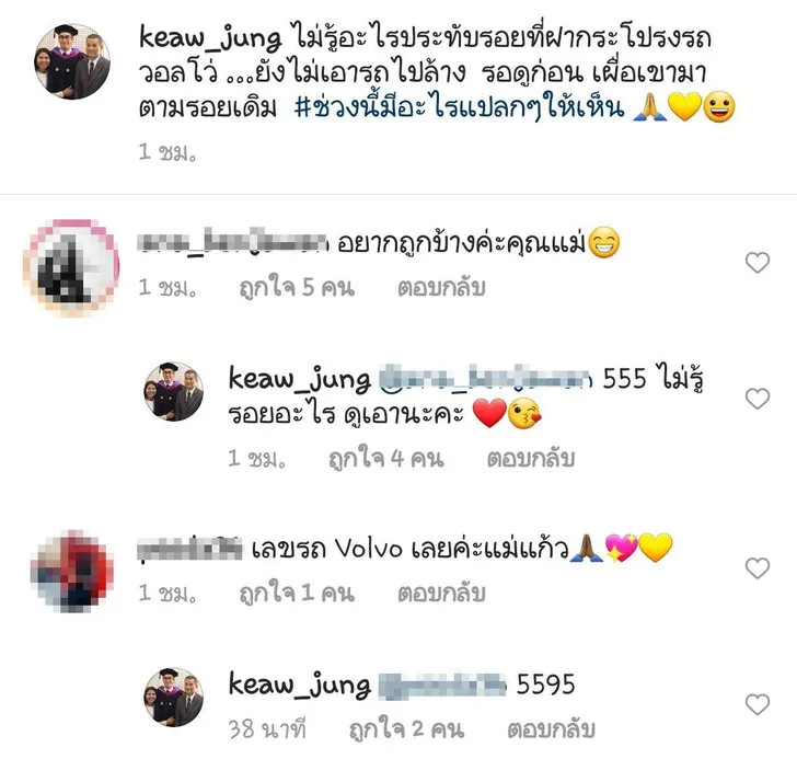 ซึ่งหลังจากที่โพสต์ดังกล่าวของ แม่แก้ว ถูกแชร์ออกไป ก็ทำให้มีทั้งแฟนคลับ ทั้งชาวเน็ต และนักเสี่ยงโชคเข้ามาคอมเมนต์อนุโมทนาสาธุอย่างคึกคัก รวมไปถึงการเข้ามาถามไถ่ แม่แก้ว เกี่ยวกับเลขทะเบียนรถคันดังกล่าว ซึ่งเจ้าตัวก็ได้คอมเมนต์ตอบกลับในภายหลังว่า "5595"