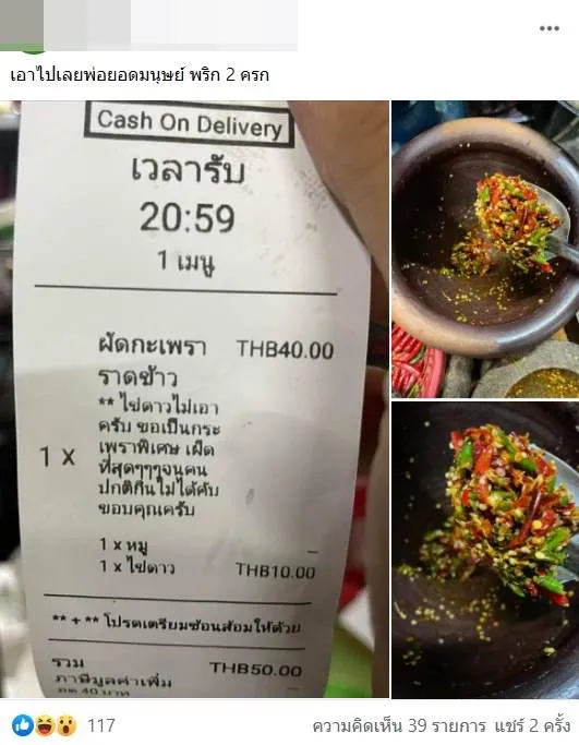 ชาวเน็ตหลายคนบอกชอบร้านที่ใส่ใจลูกค้าแบบนี้ เนื่องจากมีผู้ใช้เฟชบุ๊กท่านหนึ่งได้โพสต์ภาพของผัดกะเพรา และพริกที่กำลังเตรียมจะผัด เนื่องจากมีลูกค้าสั่งออนไลน์มา และวงเล็บ ด้วยว่าเอาเผ็ดๆ เผ็ดจนคนธรรมดากินไม่ได้ งานนี้เจ้าของร้านก็ไม่อยากให้เสียชื่อ จัดหนักให้เลยทีเดียว