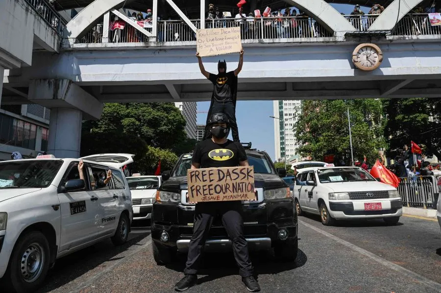 ผู้ประท้วงในชุดแบตแมน ที่นครย่างกุ้ง ถือป้ายต่อต้านรัฐประหาร "จะตายเยี่ยงวีรบุรุษ หรือทนอยู่อายุยืนเพื่อเห็นตัวเองเป็นวายร้าย"