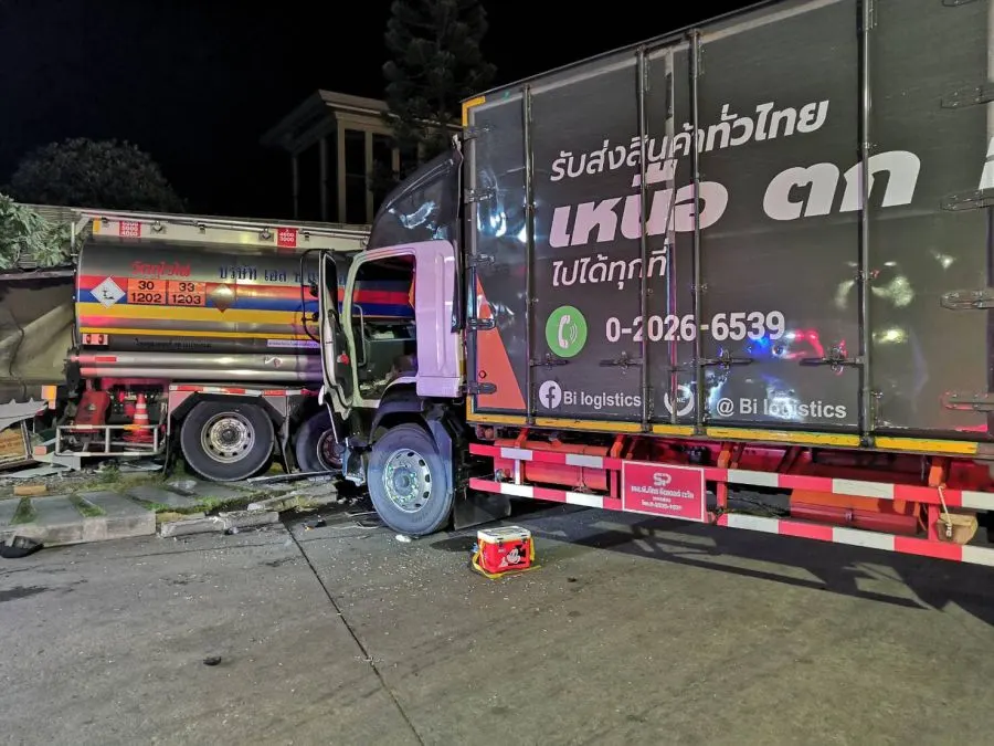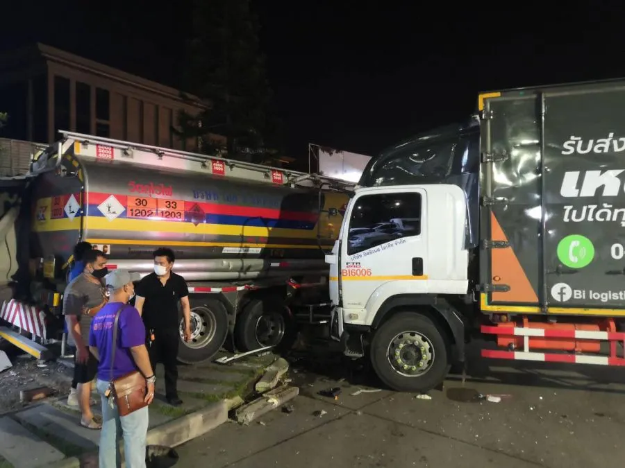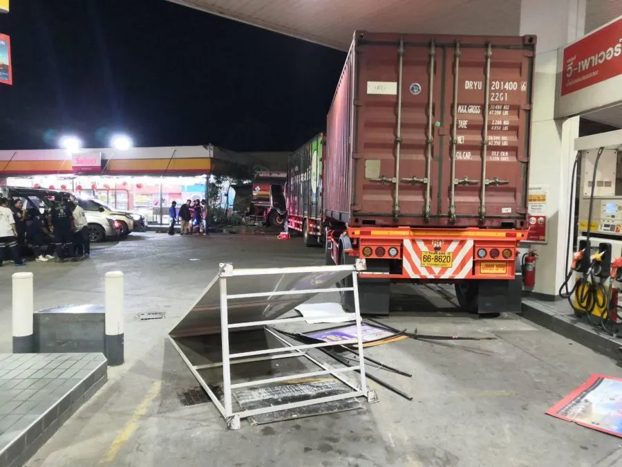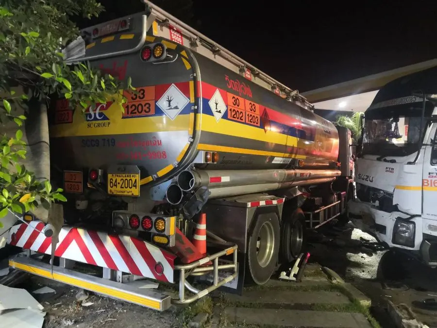 กรุงเทพมหานคร ของบริษัทแห่งหนึ่งจอดอยู่ในสภาพเกยขึ้นบาทวิถีพุ่งชนป้ายบอกทางเข้าปั๊มน้ำมัน ตัวถังฝั่งซ้ายมีร่องรอยถูกเฉี่ยวชนและครูดเป็นแนวยาว ส่วนรถคู่กรณีเป็นรถ 14 ล้อ พ่วงตู้คอนเทนเนอร์ ยี่ห้ออีซูซุ สีขาว ทะเบียน 65-7192 กรุงเทพมหานคร ของบริษัทรับส่งสินค้าทั่วราชอาณาจักรแห่งหนึ่งไถลเข้าไปหยุดอยู่ในปั๊มสภาพด้านหน้ารถยุบเสียหายหลังพุ่งชนกับรถบรรทุกนม แล้วยังแฉลบไปชนเข้ากับตัวถังด้านซ้าย ของรถบรรทุก 10 ล้อ ขนส่งน้ำมันขนาด 20,000 ลิตร ยี่ห้อสแกนเนีย สีขาว ทะเบียน 64-2004 กรุงเทพมหานคร จอดอยู่ในปั๊มสร้างความตื่นตระหนกให้กับผู้พบเห็นภาพเหตุการณ์เป็นอย่างมาก