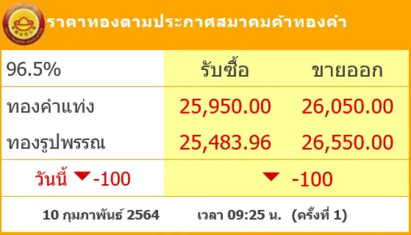 วันที่ 10 กุมภาพันธ์ 2564 สมาคมค้าทองคำรายงาน ราคาทองไทย ครั้งที่ 1 เมื่อเวลา 09:25 น. โดยราคาทองล่าสุดในวันนี้ ราคาได้มีการปรับลดลงมา 100 บาท หลังจากที่เมื่อวานนี้ราคาได้เริ่มปรับขึ้น โดยวันนี้ทองคำแท่ ง รับซื้อบาทละ 25,950 ขายออกบาทละ 26,050 บาท ส่วนทองรูปพรรณ รับซื้อบาทละ 25,483.96 ขายออกบาทละ 26,550 บาท
