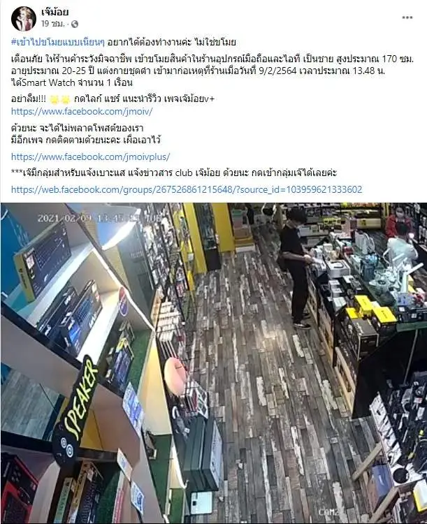 เตือนภัย ให้ร้านค้าระวังมิจฉาชีพ เข้าขโมยสินค้าในร้านอุปกรณ์มือถือและไอที เป็นชาย สูงประมาณ 170 ซม. อายุประมาณ 20-25 ปี แต่งกายชุดดำ เข้ามาก่อเหตุที่ร้านเมื่อวันที่ 9/2/2564 เวลาประมาณ 13.48 น. ได้Smart Watch จำนวน 1 เรือน