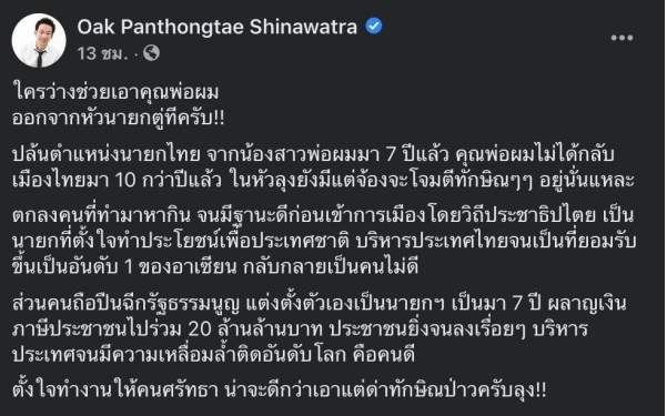 มีรายงานว่าจากทางสื่อออนไลน์ว่าเมื่อวันที่ 9 ก.พ. 2564 มีประเด็ดร้อนๆอีก ส่งตรงจากเฟสบุ๊คส่วนตัวจอง นายพานทองแท้ ชินวัตร หรือ”โอ๊ค” ทายาทของนายทักษิณ ชินวัตร ได้โพสต์ข้อความลงเฟซบุ๊กส่วนตัว “Oak Panthongtae Shinawatra” ระบุไว้ว่า