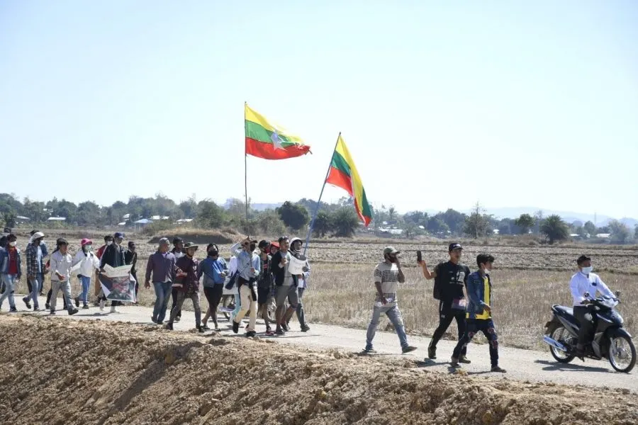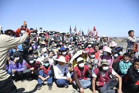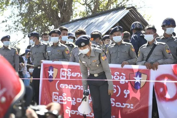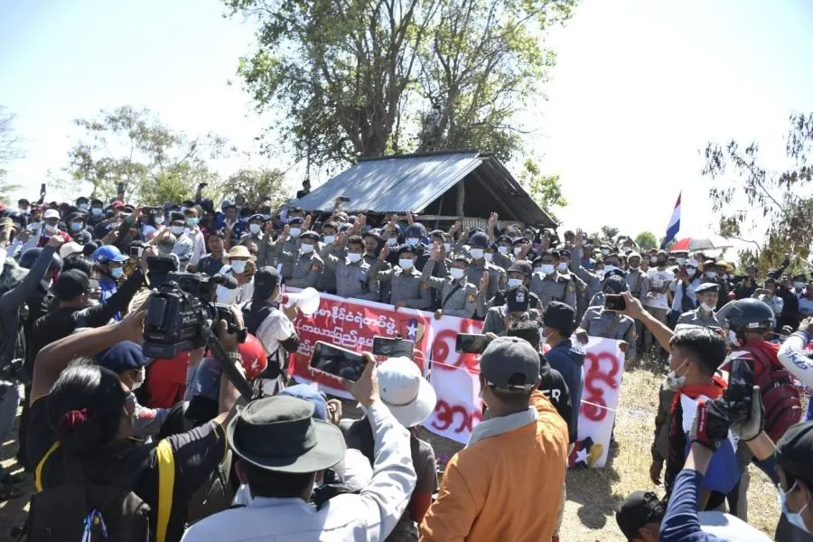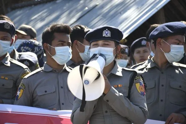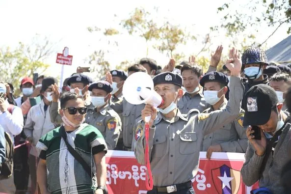 กองกําลังตํารวจ 49 นายที่เข้าร่วมกับประชาชนในวันที่ 10 กุมภาพันธ์ล้อมรอบด้วยผู้ประท้วงใกล้เจดีย์พยู