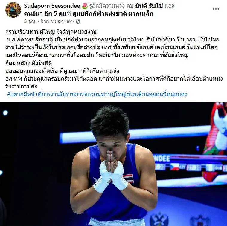 นักชกหญิง "สุดาพร" ตัดพ้อ รับใช้ชาติ 12 ปี ไม่ได้บรรจุราชการเสียที