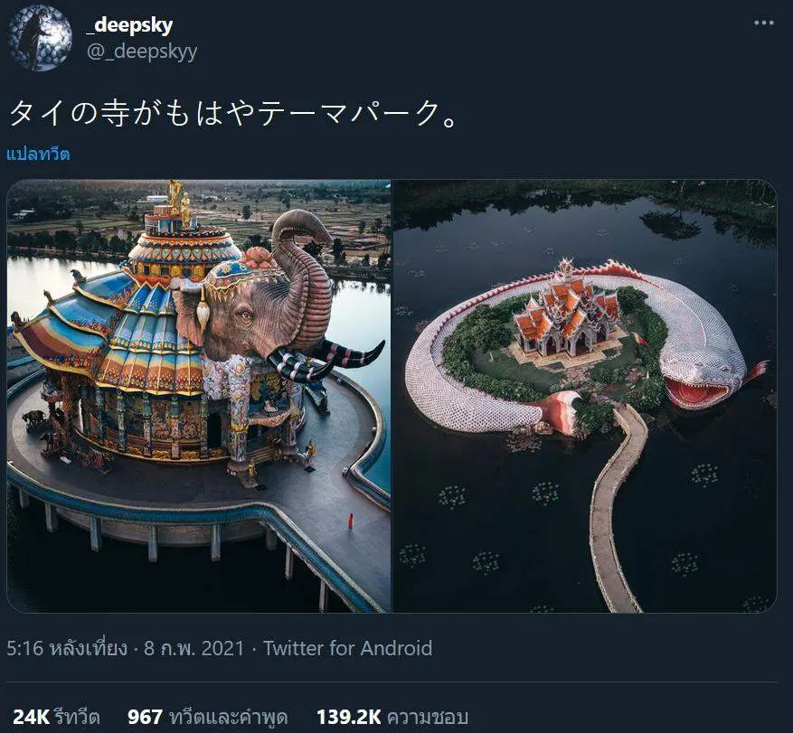 ในเมืองไทยเรา นอกจากจะมีความหลากหลายทางด้านวัฒนธรรมแล้ว ยังมีแหล่งท่องเที่ยวที่สวยงามไม่แพ้ชาติใดในโลก ล่าสุดได้สร้างชื่ออีกครั้ง เมื่อมีช่างภาพชาวญี่ปุ่น @_deepskyy ได้โพสต์ทวิตเตอร์ว่า "นี่คือวัดในประเทศไทย ไม่ใช่สวนสนุก"