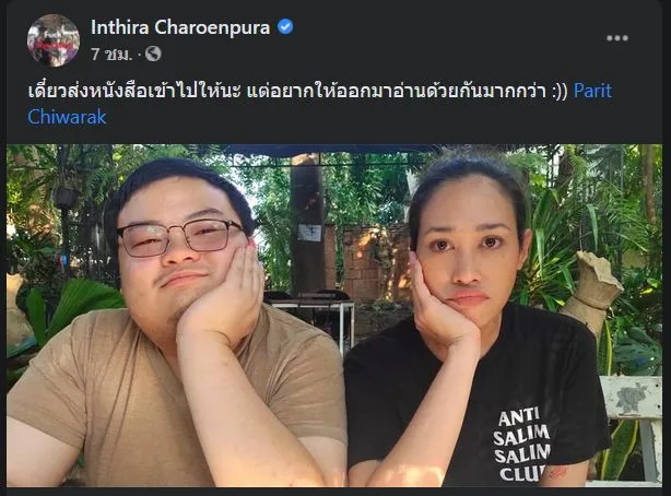 ทราย โพสต์ถึง ‘เพนกวิน’ เดี๋ยวส่งหนังสือให้ พ้อ ‘อยากให้ออกมาอ่านด้วยกัน’ มากกว่า เมื่อวันที่ 12 กุมภาพันธ์ น.ส.อินทิรา เจริญปุระ หรือ ทราย นักแสดงชื่อดัง ฉายาแม่ยกแห่งชาติ ได้โพสต์ภาพคู่ พร้อมข้อความผ่านทางเฟซบุ๊ก Inthira Charoenpura ถึง นายพริษฐ์ ชิวารักษ์ หรือ เพนกวิน แกนนำราษฎร ซึ่งกำลังถูกควบคุมตัวอยู่ในจำพิเศษกรุงเทพ โดยระบุว่า