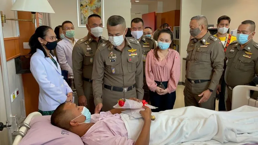 (14 ก.พ.2564) ที่โรงพยาบาลตำรวจ พล.ต.อ.สุวัฒน์ แจ้งยอดสุข ผบ.ตร. และ พล.ต.ท.ภัคพงศ์ พงษ์เภตรา ผบช.น. เดินทางมาเยี่ยมให้กำลังใจมอบกระเช้าดอกไม้และเงินช่วยเหลือกับตำรวจที่ได้รับบาดเจ็บจากการปฏิบัติหน้าที่ ควบคุมสถานการณ์กรณีผู้ชุมนุมบริเวณสนามหลวงเมื่อ วานนี้(13 ก.พ.) โดยตำรวจที่บาดเจ็บรักษาตัวในโรงพยาบาลจำนวน 23 นาย ซึ่งแพทย์อนุญาตให้กลับบ้านแล้ว 4 นาย