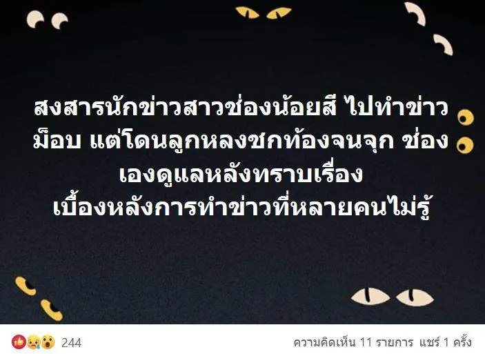 ล่าสุดเพจชื่อดังได้ออกมาโพสต์ถึง นักข่าวช่องน้อยสีท่านหนึ่งที่ออกไปทำข่าว เมื่อวานนี้ (14 กพ.) แต่โดนลูกหลง ไม่ได้ระบุว่า จากฝ่ายตำรวจ หรือ ฝ่ายม็อบ โดยระบุว่า..