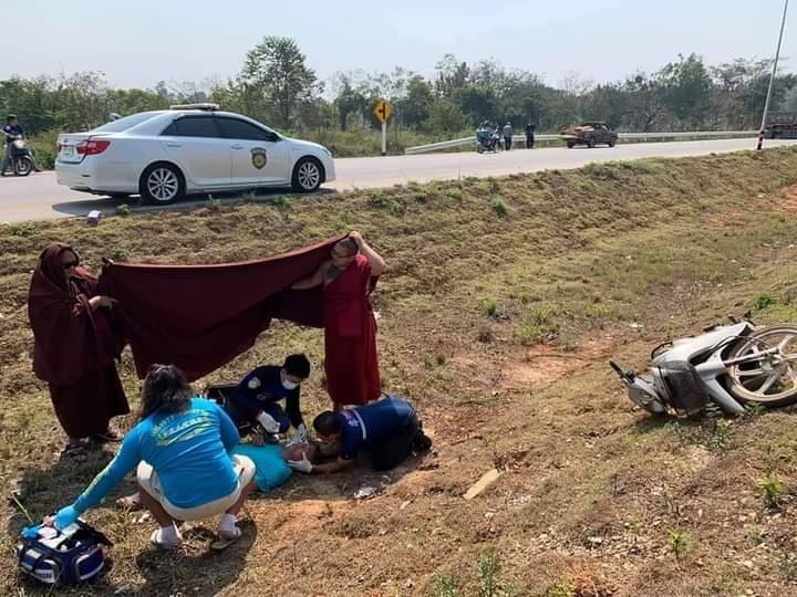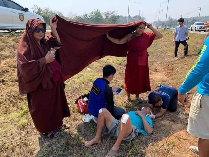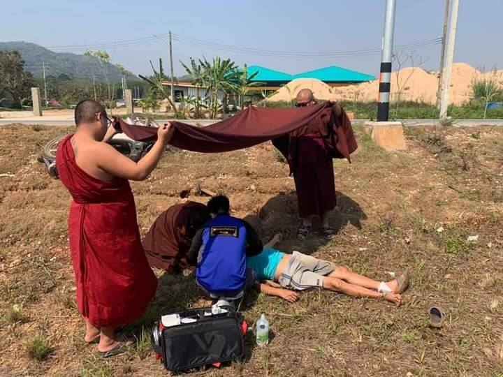 เรื่องราวดีๆเกิดขึ้นเมื่อพระสงฆ์ วัดแสงแก้วโพธิญาณ กำลังช่วยผู้ประสบเหตุ โดยใช้จีวร บังแดดผู้บาดเจ็บระกว่างรอแพทย์ช่วยเหลือ
