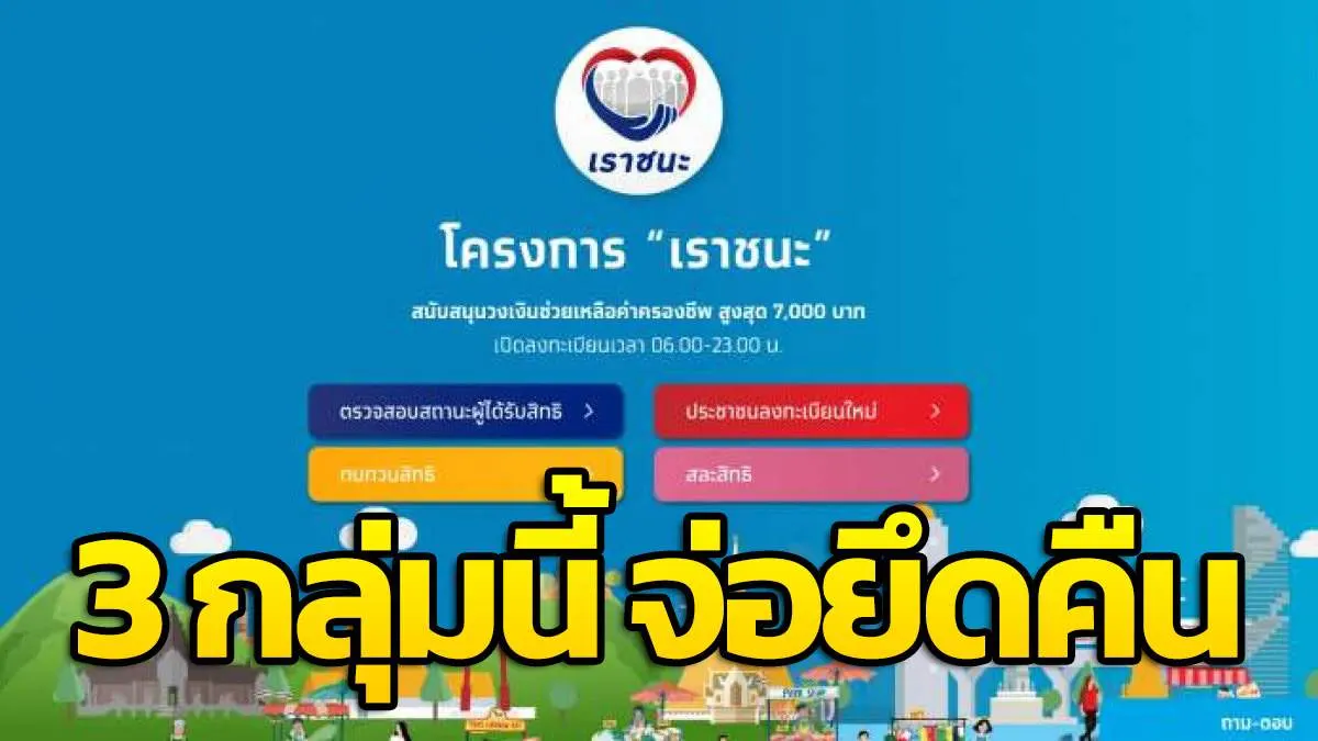 เราชนะ เพิ่มปุ่ม สละสิทธิ สำหรับ 3 กลุ่มที่ไม่ผ่านคุณสมบัติ หากได้รับสิทธิแล้ว จะต้องเข้าไปกด สละสิทธิ ไม่อย่างนั้นจะถูกเรียกเงินคืน วันนี้ (15 ก.พ.) ถ้าเข้าไปที่เว็บไซต์ เราชนะ.com จะมีแถบสีชมพูพร้อมข้อความว่า สละสิทธิ ซึ่งผู้ที่มีคุณสมบัติไม่ตรงตามเงื่อนไขของโครงการ คือ ไม่ใช่ผู้มีรายได้น้อย เกษตรกร อาชีพอิสระ ผู้ถือบัตรสวัสดิการแห่งรัฐ รวมถึงกลุ่มที่ได้รับสิทธิโครงการ คนละครึ่ง หรือเราเที่ยวด้วยกัน จะต้องเข้าไปกด สละสิทธิ