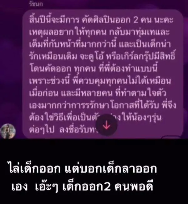 "สิ้นปีนี้จะมีการคัดศิลปินออก 2 คน นะคะ เหตุผลอยากให้ทุกคน กลับมาทุ่มเทและเต็มที่กับหน้าที่มากกว่านี้ และเป็นเด็กน่ารักเหมือนเดิม