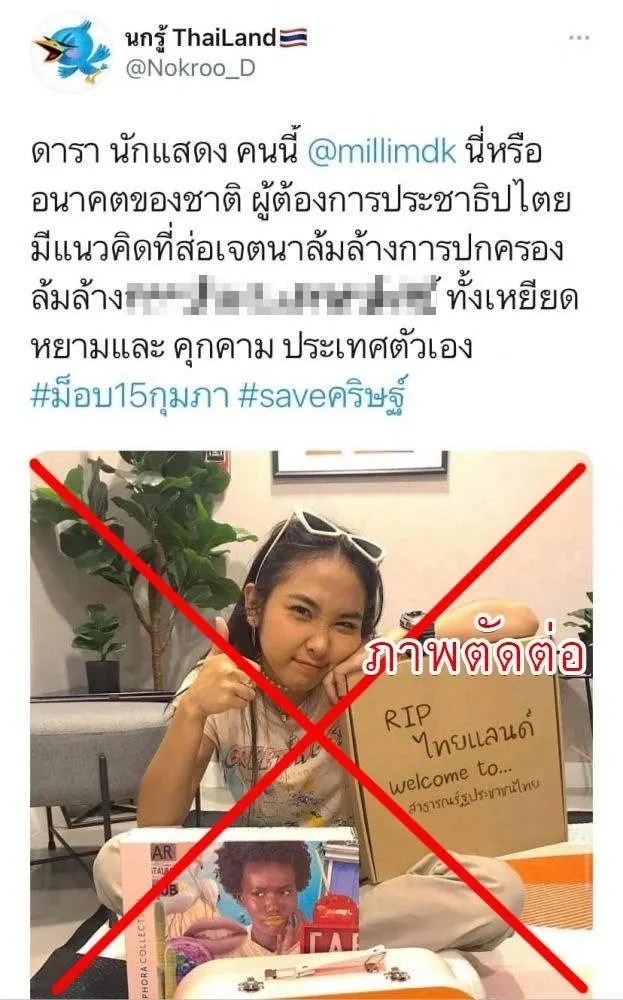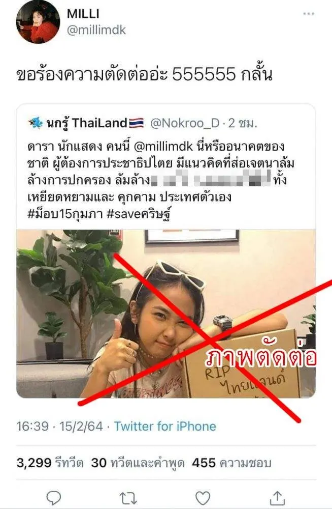 สลิ่ม จวก "มิลลิ" ลั่น "เหยียดหยาม คุกคามประเทศ นี่หรืออนาคตของชาติ" แต่ที่แท้ดันเป็นภาพตัดต่อ