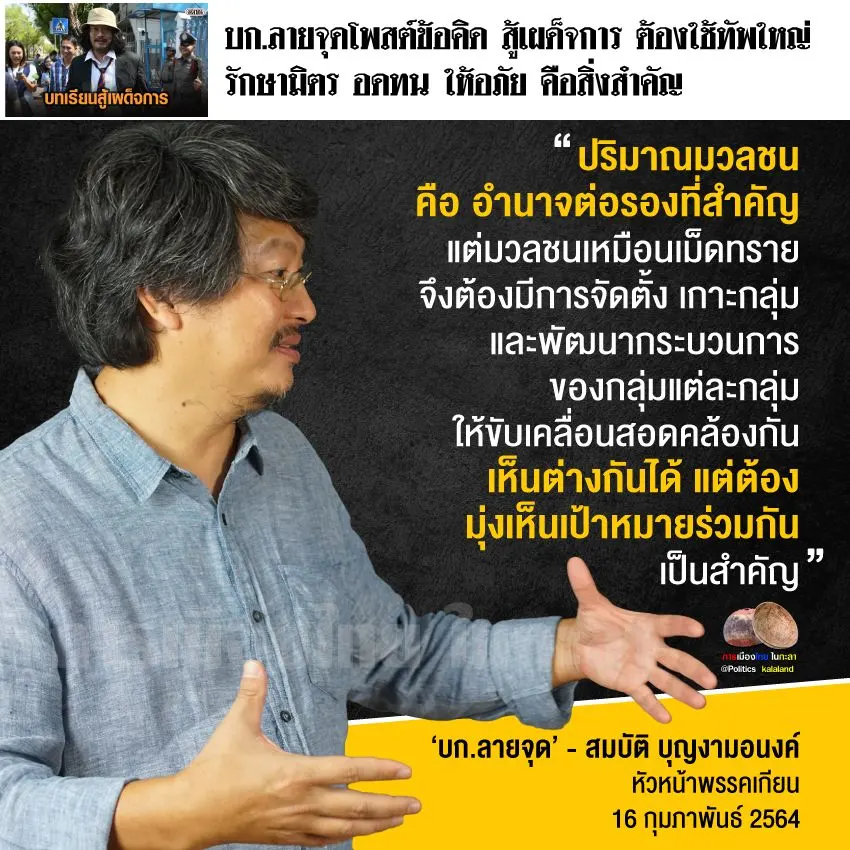เมื่อวันที่ 16 กุมภาพันธ์ สมบัติ บุญงามอนงค์ หัวหน้าพรรคเกียน นักเคลื่อนไหวและนักกิจกรรมการเมือง โพสต์ข้อความทางเฟซบุ๊กแสดงความเห็นเรื่องการเปลี่ยนแปลงทางการเมืองของประชาชน โดยระบุว่า