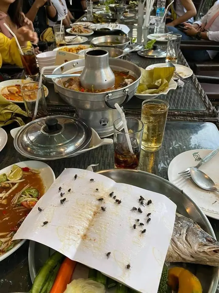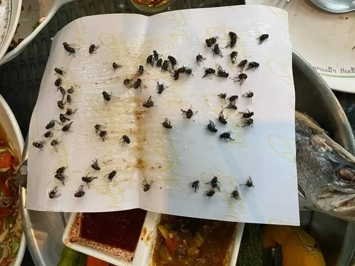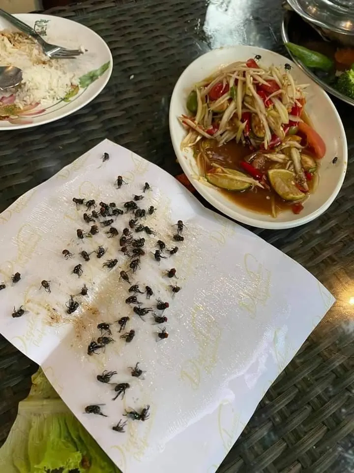 สักพักอาหารมาเสิร์ฟ แมลงวันก็เริ่มมา
