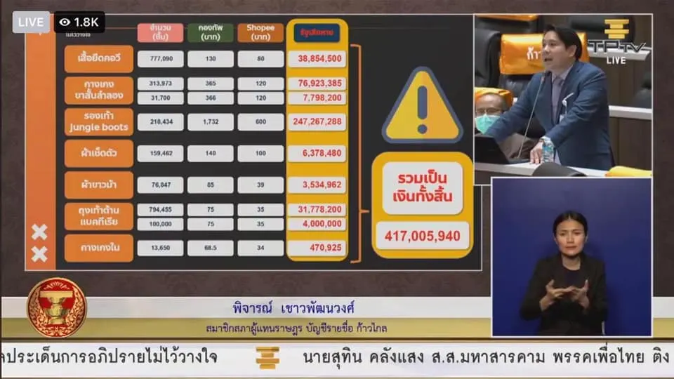 สส.ฝ่ายค้านพรรคก้าวไกลอภิปรายเกี่ยวกับการจัดซื้อจัดจ้างข้าวของเครื่องใช้ให้กำลังพล ตั้งแต่กางเกงใน ถุงเท้า รองเท้า เสื้อยืด